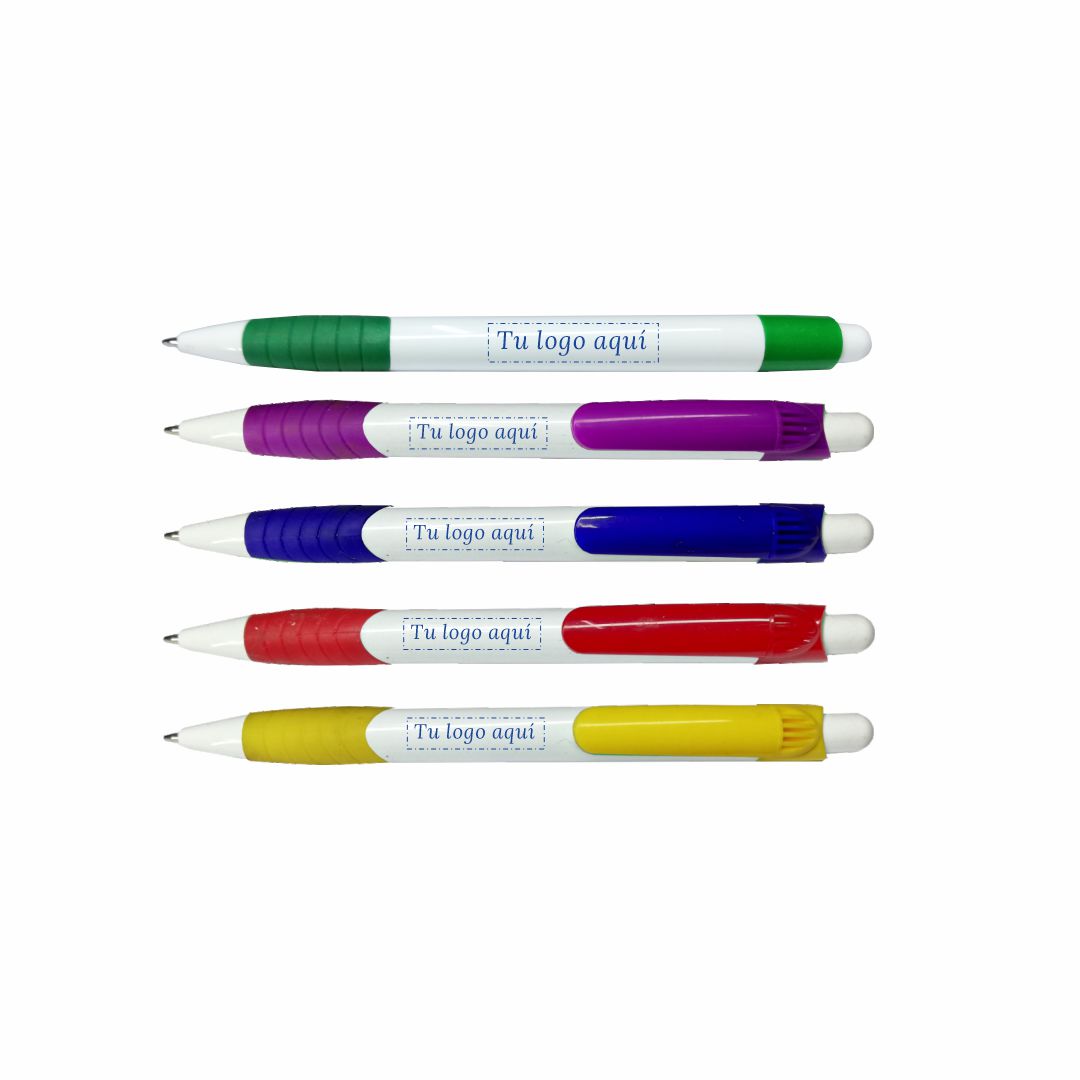 Lapiceros promocionales marca STYB, modelo Sydney. Mecanismo retráctil y grip ergonómico. Pueden personalizarse tanto en cuerpo como clip.