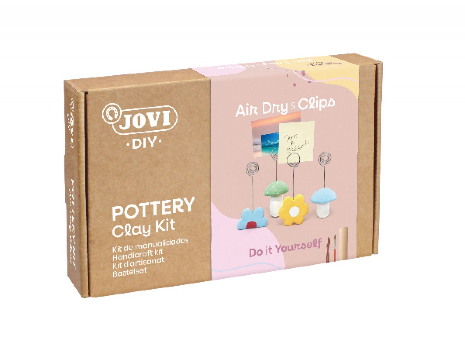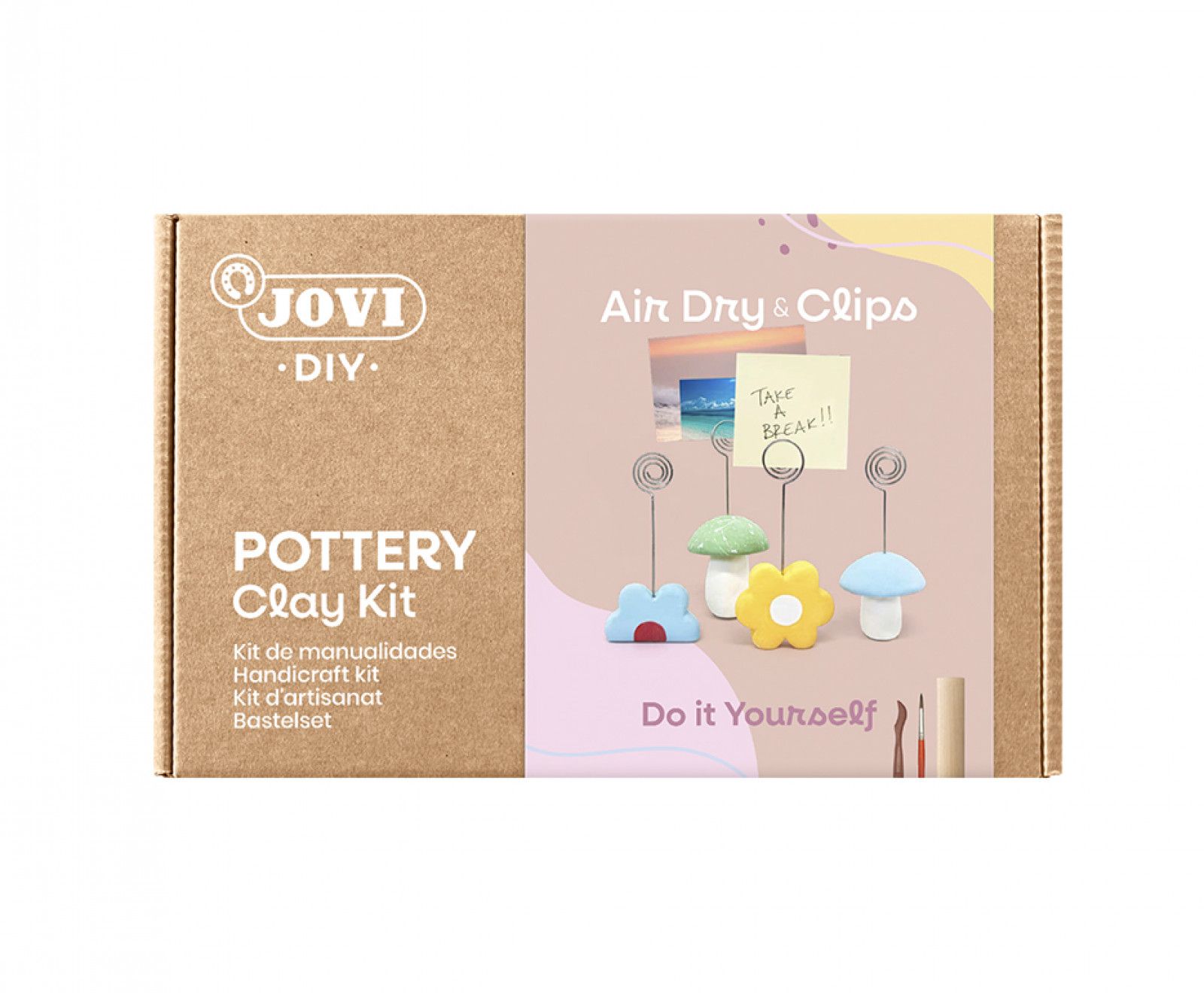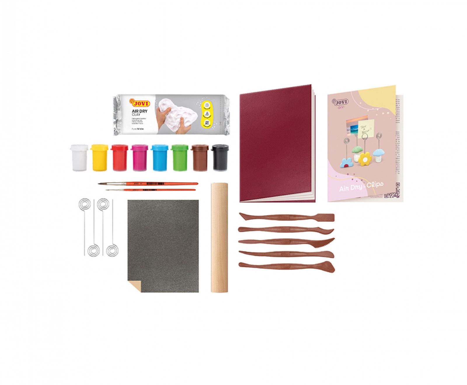 Incluye instrucciones paso a paso con enlace al vídeo tutorial, pastilla de AirDry de 500g, 1 rodillo de madera, 5 herramientas de modelaje, 1 hoja de papel de lija, 8 colores de pintura Gouache Tempera de 15ml, 2 pinceles calibrados, 1 libreta y 4 clips.